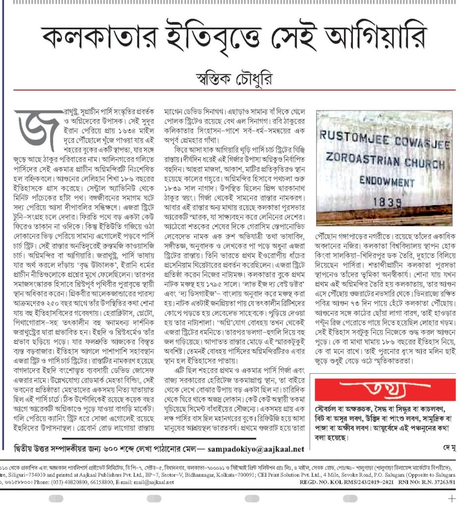 কিছুদিন আগেই পুড়ে ছাই হয়ে গেল এই শহরের সবচেয়ে প্রাচীন ও একমাত্র পার্সি চার্চ। অগ্নিমন্দির বা আগিয়ারির স্থান হল অগ্নিগর্ভে। সরকারের হেরিটেজ তকমা থাকলেও বিশেষ হেলদোল নেই কারুরই। কেইবা মাথা ঘামায় ১৮৬ বছরের ইতিহাস নিয়ে। তাই সামনে দিব্যি বেড়ে ওঠে দখলরাজ। পুড়ে খাক হয়ে যায় ইতিহাস। মনখারাপের শহরে বোধহয় আর কিচ্ছু ভালো হওয়ার নেই। জার্মান দার্শনিক ও লেখক ফ্রেডরিখ ভিলহেল্ম নিচের জরাথুষ্ট্রকে অবলম্বন করে লেখা বইয়ের সেই অমোঘ উক্তি মনে পড়ে যায় – ‘ঈশ্বরের মৃত্যু হয়েছে এবং আমরা তাকে হত্যা করেছি !’ সেই ‘অগ্নিদেবের অগ্নিশয্যা’কে নিয়ে দু’চার লাইন আজকের আজকালের পাতায়…