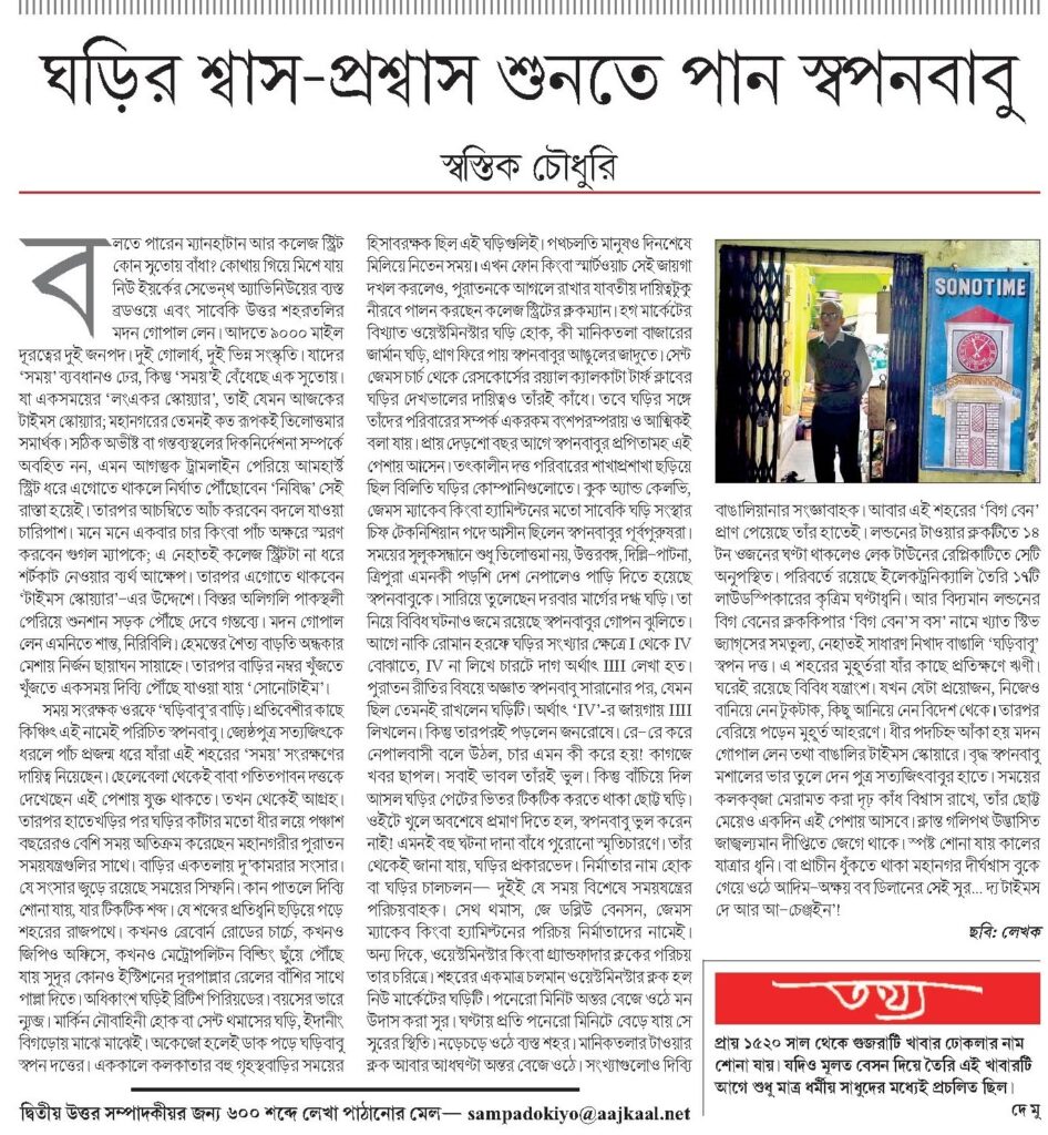 বাড়ির এক তলায় দু’কামরার সংসার। যে সংসার জুড়ে রয়েছে সময়ের সিম্ফনি। কান পাতলে দিব্যি শোনা যায়, যার টিকটিক শব্দ। যে শব্দের প্রতিধ্বনি ছড়িয়ে পড়ে শহরের রাজপথে। কখনো ব্রেবোর্ণ রোডের চার্চে, কখনো জিপিও অফিসে, কখনো মেট্রোপলিটন বিল্ডিং ছুঁয়ে পৌঁছে যায় সুদূর কোনো ইস্টিশনের দূরপাল্লার রেলের বাঁশির সাথে পাল্লা দিতে। এ শহরের ঘড়িবাবুকে নিয়ে একটি লেখা আজকের আজকালের পাতায়…